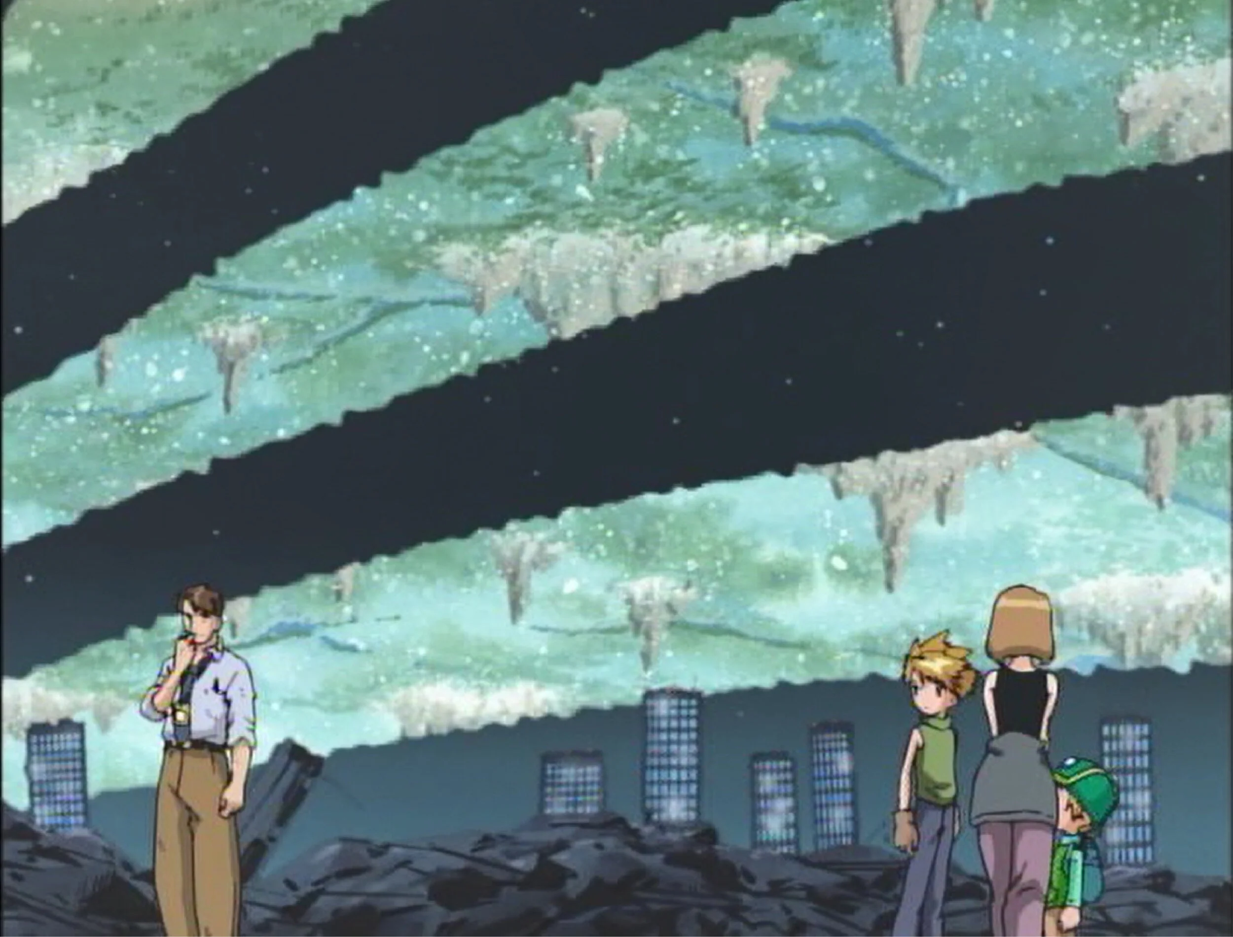 Garudamon dives down to protect Sora and Tai from an attack, and this moment clinches it for everyone. They are positive that this has all happened before. But it wasn’t Garudamon and Mammothmon, it was Greymon (not Tai’s) and Parrotmon. There was never a terrorist attack, it was just how people explained away all the destruction from two giant monsters fighting.